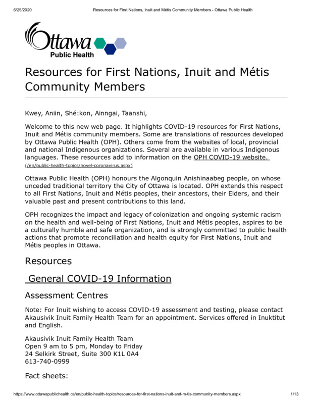 A collection of resources regarding covid-19 produced by various government and community associations across the country specifically for indigenous people. It was produced by Ottawa Public Health. The resources are in a variety of indigenous languages including Cree, Ojibwe, Mi'kmaq, Inuktitut, and Algonquin, which touch on a variety of issues, including those which have uniquely cultural significance such as tobacco use.