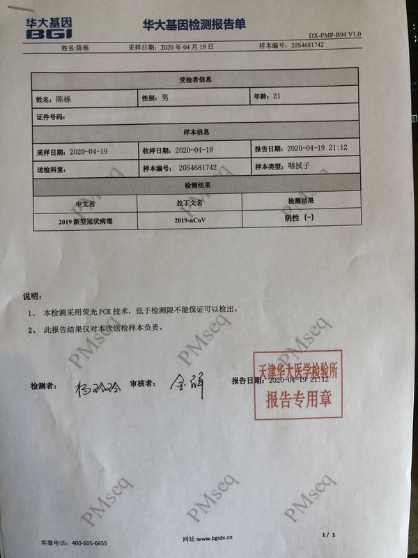 After 14-days of quarantine in the hotel, we must take the COVID 19 test before we left to make sure that we were not virus carriers. I took the test on April 18, 8 A.M. We were suggested not to eat before taking the test because the test may cause stomach-churning. I received the report on the next day. The result showed negative and I was allowed to leave and end my 14-day quarantine life.
