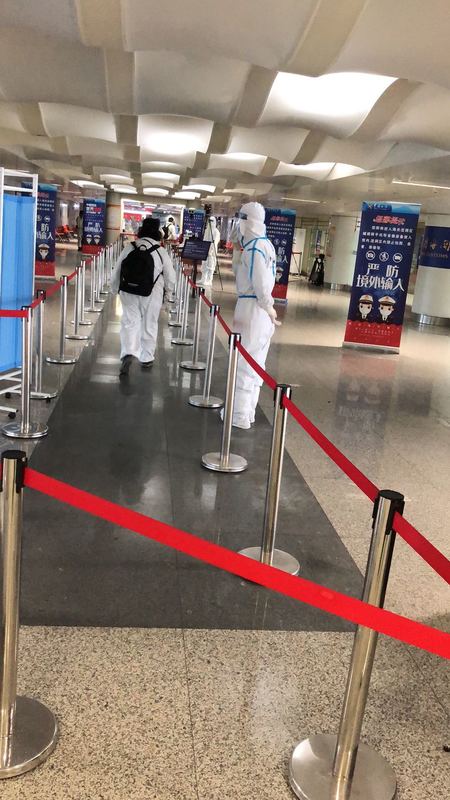 When I arrived at Chinese Customs on April 6, I didn't expect an inspection as strict as this. We were accompanied by dozens of staff at almost every corner, all of them wearing protective suits and N95 masks. We were then being lead to do nucleic acid testing one by one. After the test, we were questioned by the staff about where we were coming from and whether we had been exposed to COVID 19 patients. The whole process lasted for about one and a half hours. Then, we were transported to the government-issued hotel for 14 days quarantine.