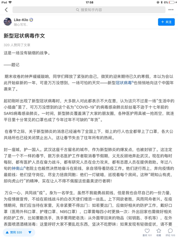 The screenshot is a writing assignment submitted by student during the plague in China, it indicates the shift of social attention to the virus and also the effort people have put into resolving this issue.