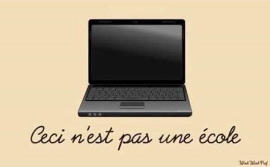 Parody of the famous Rene Magritte painting "The Treachery of Images (This is Not a Pipe)." During this crisis, many schools around the world have moved to an online-learning format. Most educators (and most students) say this is no substitute for in-person classes, however. There may be pressure once this is all over for online / distance learning to remain a prominent element of education, but many educators are pushing back against this.