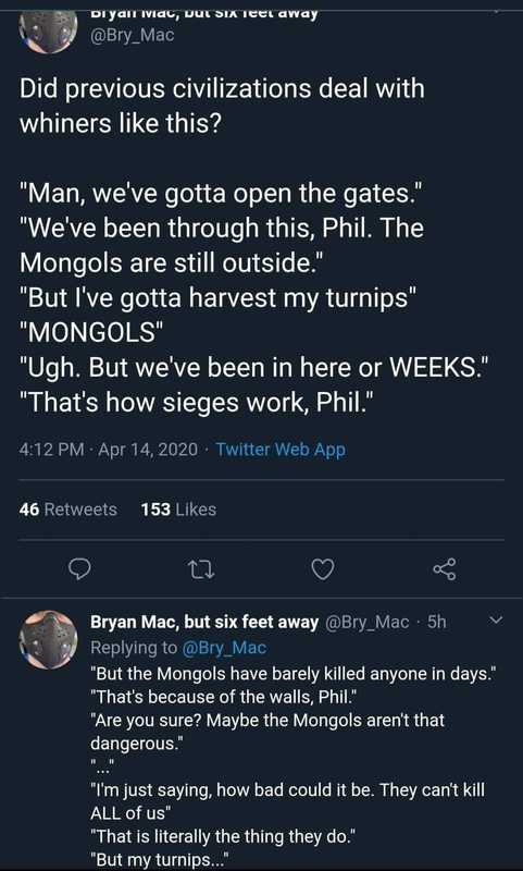 A series of tweets using a Mongol siege as a metaphor for the current lockdown, and the absurdity of trying to open up again too early.