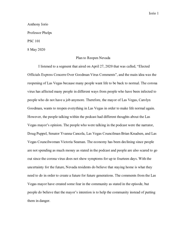 A student's paper discussing a KNPR program on the topic of reopening Las Vegas and Clark County, Nevada in the midst of the pandemic.