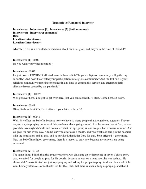 “You know it's really strengthened my belief that there is a God not because of any large-scale event but mostly because of all the small things going on in my life.” “Well like you said before, I was sent home from my mission in Africa about six months ago or actually about six months earlier than I was supposed to and since being back all of our worship gatherings have been canceled so yeah it's definitely affected my participation in the religious community.” “Well there's been two worldwide fasts to stop the spread and I'm also pretty sure that there's been some donations made but I know those records aren't really that public.”