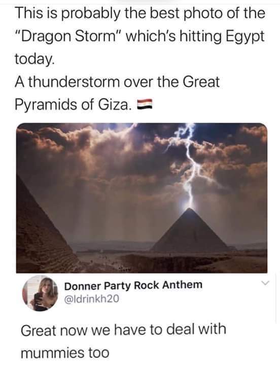 Covid19 meme posted on Facebook which ironically describes a lighting strike on the pyramids in Egypt.