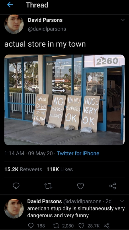 Increasingly social distancing measures have taken on a political element in the United States. This post shows a store in the author's hometown proudly advertising that masks are not allowed in the store, that handshakes and hugs are OK and that they are "open to the Truth". Absent a consistent set of messages from the top levels of government many different theories and ideas about liberty VS public safety have taken hold.