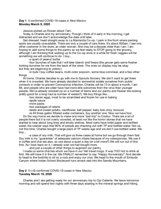 I began this journal March 9, 2020, two days before New Mexico's first confirmed COVID-19 cases. March 9 was my husband and my 19th wedding anniversary and the day we last shopped for groceries. This originated as a Pages document on my iPad. I am writing to document this experience, not knowing how things will turn out for us and our family. I am writing as a way to explore my own responses to the pandemic. I have shared responses from my daughter to my journal in a couple of places in the journal. 3/09/2020 through 5/10/2020 and ongoing. My husband and I are retired and recently moved to a new neighborhood. We have absolutely LOVED our time here. We are located just a block from the University of New Mexico and just four short blocks from the Nob Hill district. We are within walking distance of many restaurants and are just minutes from several bus lines. We would often hop on the bus to downtown or uptown. We haven't ridden the busses since early March, we haven't been to a restaurant either. Our granddaughter is living with us full time, now, because of the COVID-19 pandemic. Her mother, my daughter, is a respiratory therapist at a hospital. [curator's note]: from the "Tell us More" page on Omeka net.
