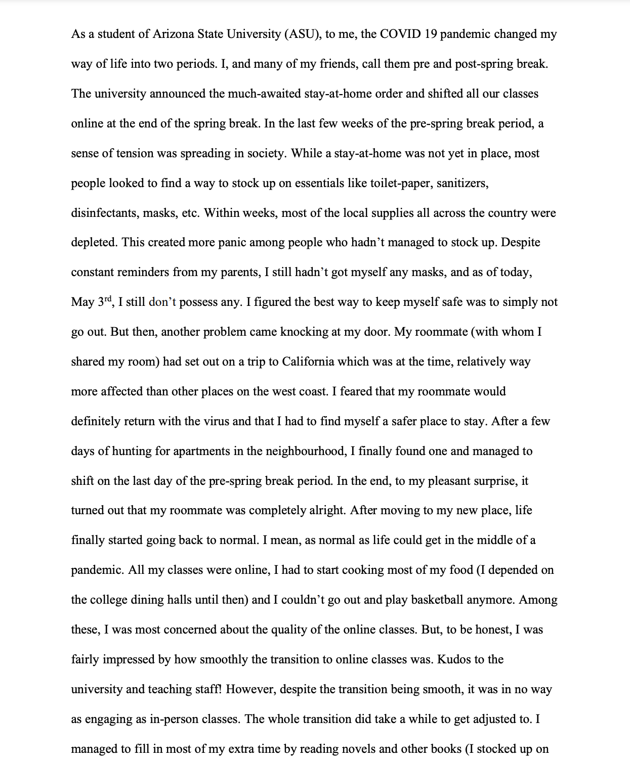 Life has changed so much in such little time. The things people used to do on a daily basis has been shaken up dramatically. The stay at home rules were put into effect almost two months ago. I have not been able to see my friends or certain family members even though I am finally back home. I have been trying to get out as much as I can whether that be running by the beach or just going out and exploring nature. It has been really difficult for me dealing with all this, but I have been trying to fill my time being outside. I do not take the beautiful area that I live in for granted anymore. The other day I went to the river by myself, which I hardly ever do, and just sat and enjoyed the sun reaching down on my body. It was quite peaceful and since I am taking a full course load, very relaxing. We now have to wear masks when entering “essential” businesses in our state, California. I was yelled at by a gas station worker the morning it was put into effect because I was not wearing a mask. I was mad at first but then I realized this poor man was just trying to do his job. I tried to reason with the man saying no one else was here and that I had literally seen him the day before when I got some snacks. He ended up kicking me out and I did not get the bottle of water I needed. People have changed a lot too. They are more fearful of each other than they were before. I realize this everyday as I go on walks with my mother. For every person that would smile at us, two others would stray away fearful that our breath may contaminate them. For me and my peers, this is the first time we have ever seen mass-hysteria. I was talking to this with my father about how fear can lead people to do drastic things. That is what is scary to me. What happens when people begin to steal because they can no longer work the jobs they had and provide for themselves and their families? What happens when people begin to riot because they no longer feel able to endure not having a steady stream of income? What will the world look like after all this is over?