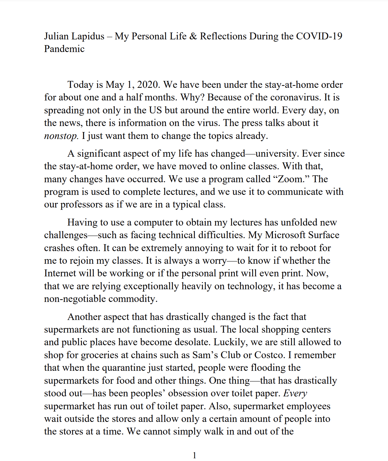 The text describes my personal reflections and life during the COVID-19 Pandemic