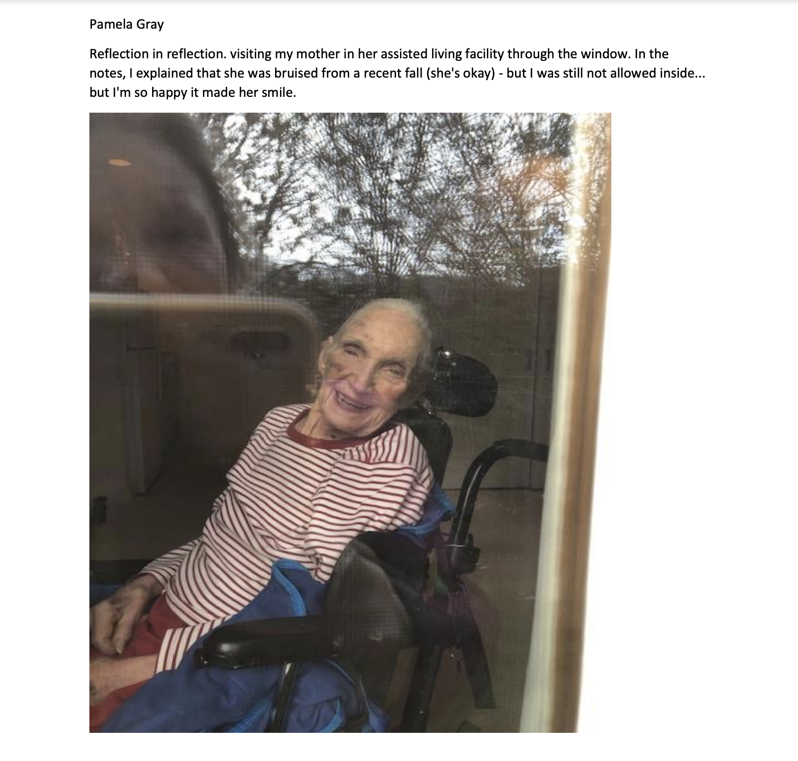 Visiting my mother through the window at her assisted living facility.