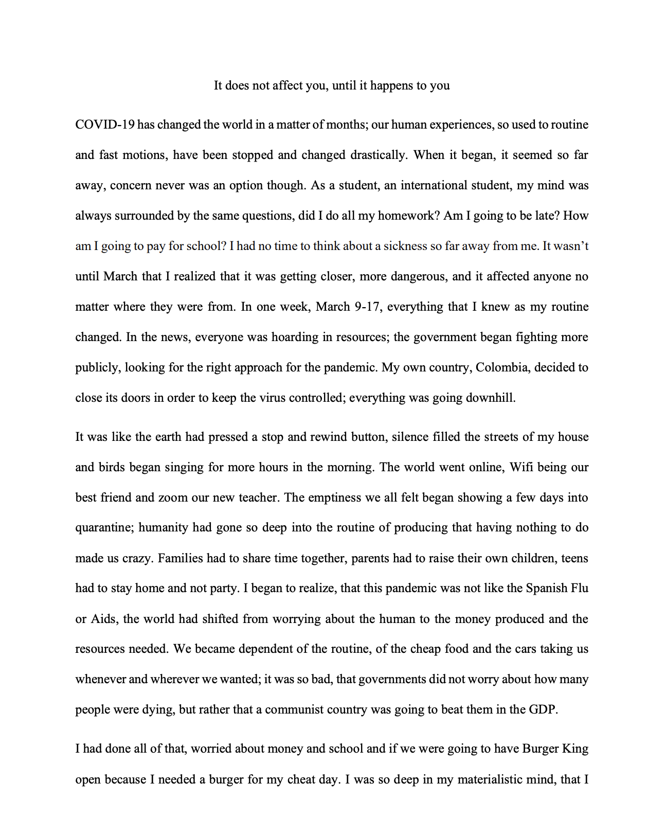 College student's perspective on senior year ending during the COVID-19 pandemic.