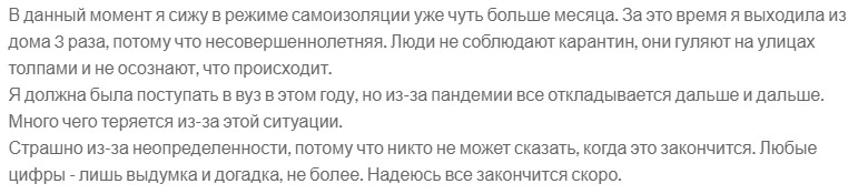 Here comes the second month of quarantine in our country. There are people who observe quarantine, and there are people who do not care about the situation and they continue to live as they lived before. Students, schoolchildren are studying remotely. I envy them, of course. Studying at home is so great. But there are disadvantages of such an education, schoolchildren are stupid. After all, some parents do their own homework, and children are not explained anything. Beauty salons, trading houses, markets are closed. Only grocery stores are open. In certain shops we only let in 5 people, and at this time on the street 20 people are waiting for their turn to enter the shop and people do not even keep a distance from us being on the street. There are practically no cars on the street. In our city, it is completely banned to travel by private transport, allowed only to certain people. It became so free at once. Public transport has been restricted, it only goes in the morning or evening, but these buses go in small quantities. It's quicker to walk to work. Some people are panicking. They don't know what happens next...