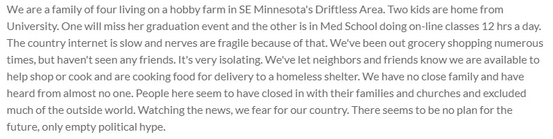We are a family of four living on a hobby farm in SE Minnesota's Driftless Area. Two kids are home from University. One will miss her graduation event and the other is in Med School doing on-line classes 12 hrs a day. The country internet is slow and nerves are fragile because of that. We've been out grocery shopping numerous times, but haven't seen any friends. It's very isolating. We've let neighbors and friends know we are available to help shop or cook and are cooking food for delivery to a homeless shelter. We have no close family and have heard from almost no one. People here seem to have closed in with their families and churches and excluded much of the outside world. Watching the news, we fear for our country. There seems to be no plan for the future, only empty political hype.