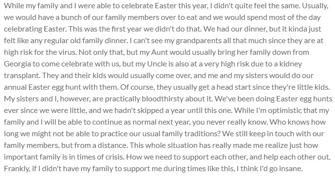While my family and I were able to celebrate Easter this year, I didn't quite feel the same. Usually, we would have a bunch of our family members over to eat and we would spend most of the day celebrating Easter. This was the first year we didn't do that. We had our dinner, but it kinda just felt like any regular old family dinner. I can't see my grandparents all that much since they are at high risk for the virus. Not only that, but my Aunt would usually bring her family down from Georgia to come celebrate with us, but my Uncle is also at a very high risk due to a kidney transplant. They and their kids would usually come over, and me and my sisters would do our annual Easter egg hunt with them. Of course, they usually get a head start since they're little kids. My sisters and I, however, are practically bloodthirsty about it. We've been doing Easter egg hunts ever since we were little, and we hadn't skipped a year until this one. While I'm optimistic that my family and I will be able to continue as normal next year, you never really know. Who knows how long we might not be able to practice our usual family traditions? We still keep in touch with our family members, but from a distance. This whole situation has really made me realize just how important family is in times of crisis. How we need to support each other, and help each other out. Frankly, if I didn't have my family to support me during times like this, I think I'd go insane.