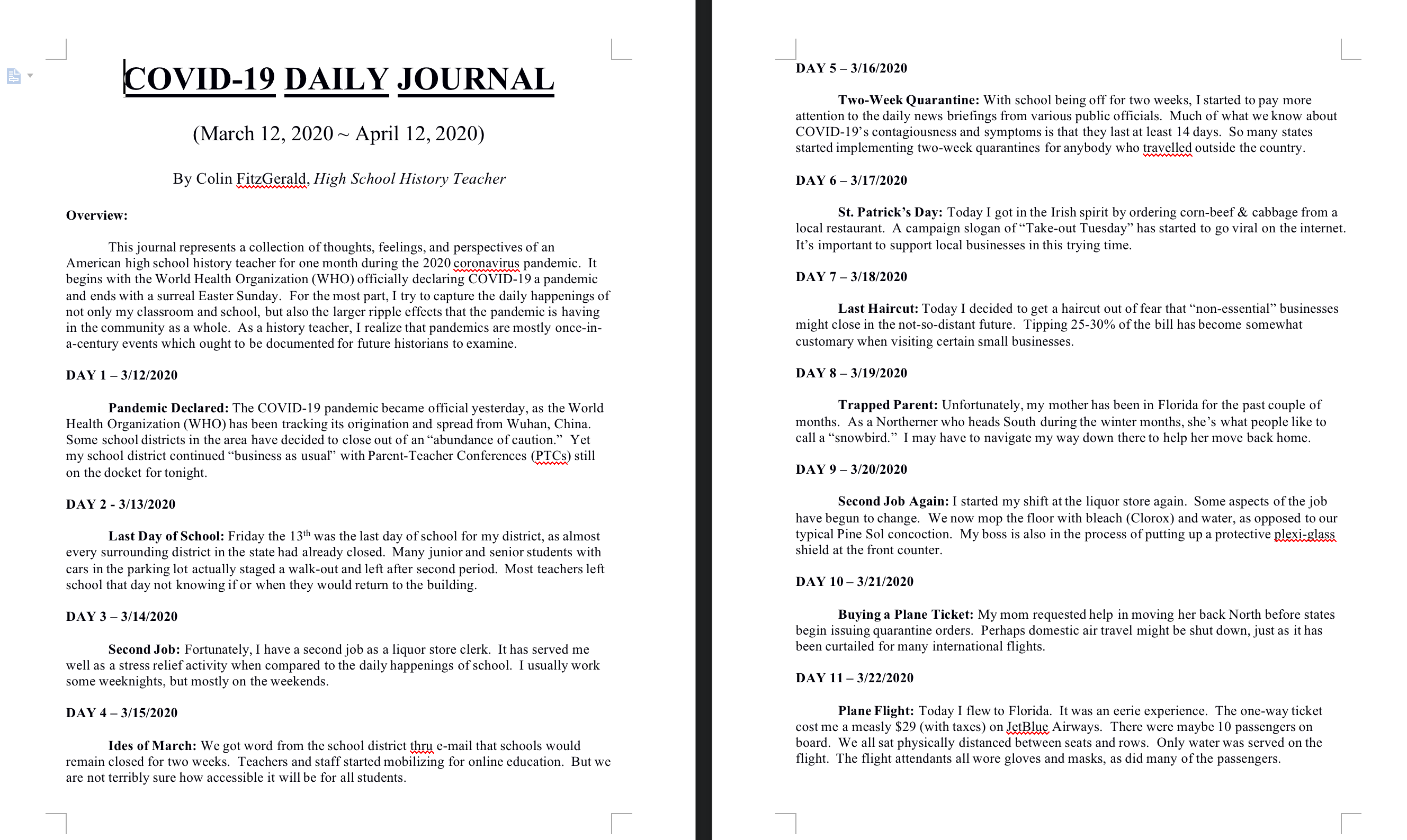 A history teacher's perspective of COVID-19 pandemic in his journal.