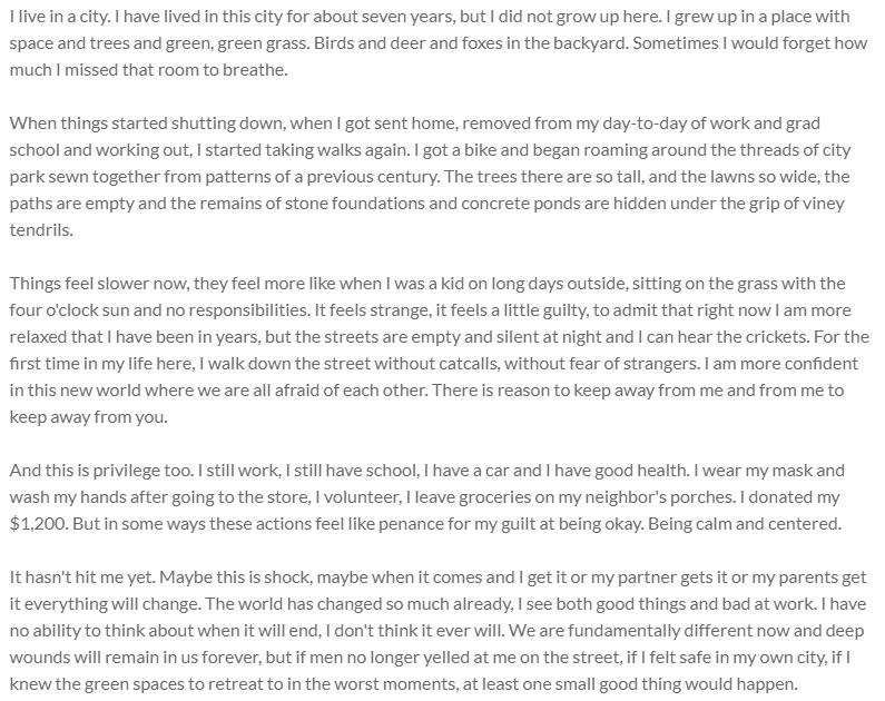 It hasn't hit me yet. Maybe this is shock, maybe when it comes and I get it or my partner gets it or my parents get it everything will change. The world has changed so much already, I see both good things and bad at work. I have no ability to think about when it will end, I don't think it ever will. We are fundamentally different now and deep wounds will remain in us forever, but if men no longer yelled at me on the street, if I felt safe in my own city, if I knew the green spaces to retreat to in the worst moments, at least one small good thing would happen.