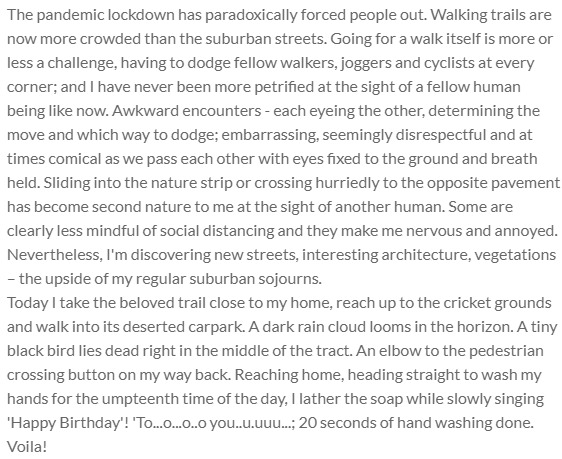 Reflection of having one's day slow down during the COVID-19 pandemic.