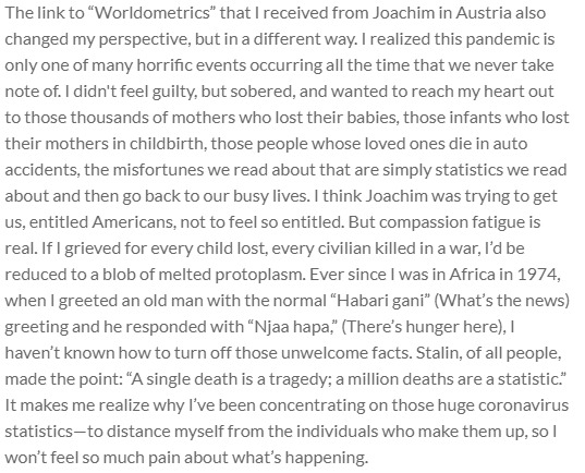 Perspective of how deaths can have a tremendous effect on people.