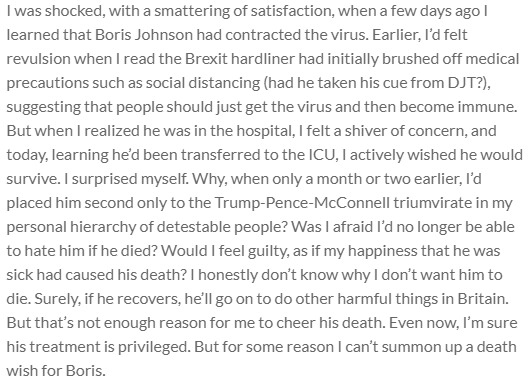 Description of feelings on Boris Johnson getting the COVID-19 virus.