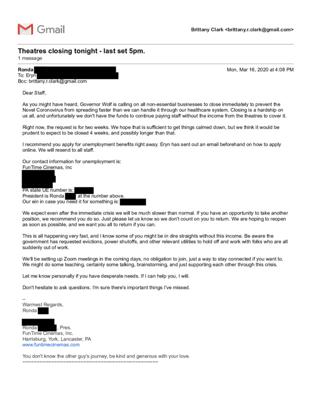 This is an email sent by the President of the small, locally-owned movie theater I work at telling us that the theater will close down due to state-wide mandates that non-essential businesses close. It also suggests signing up for unemployment insurance, and what may happen once we are allowed to re-open.