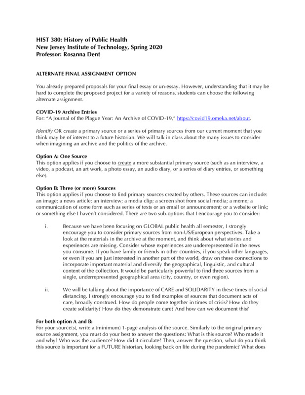 This is an alternate final assignment created for the course HIST 380: History of Public Health, an upper level history course at New Jersey Institute of Technology. Given the challenges of transitioning to online-only instruction, the upheaval of the pandemic, and the reframing of the course to address historical precedents of COVID-19 more explicitly, students were given the option of creating content for this archive.