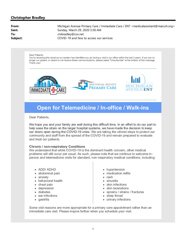 The Michigan Avenue Primary Care clinic in Chicago has been providing weekly updates to patients via email regarding operating procedures to prevent the spread of the virus and how it is offering COVID-19 testing.