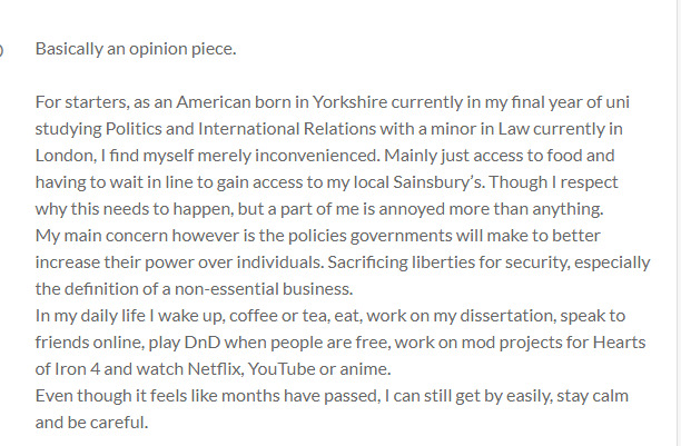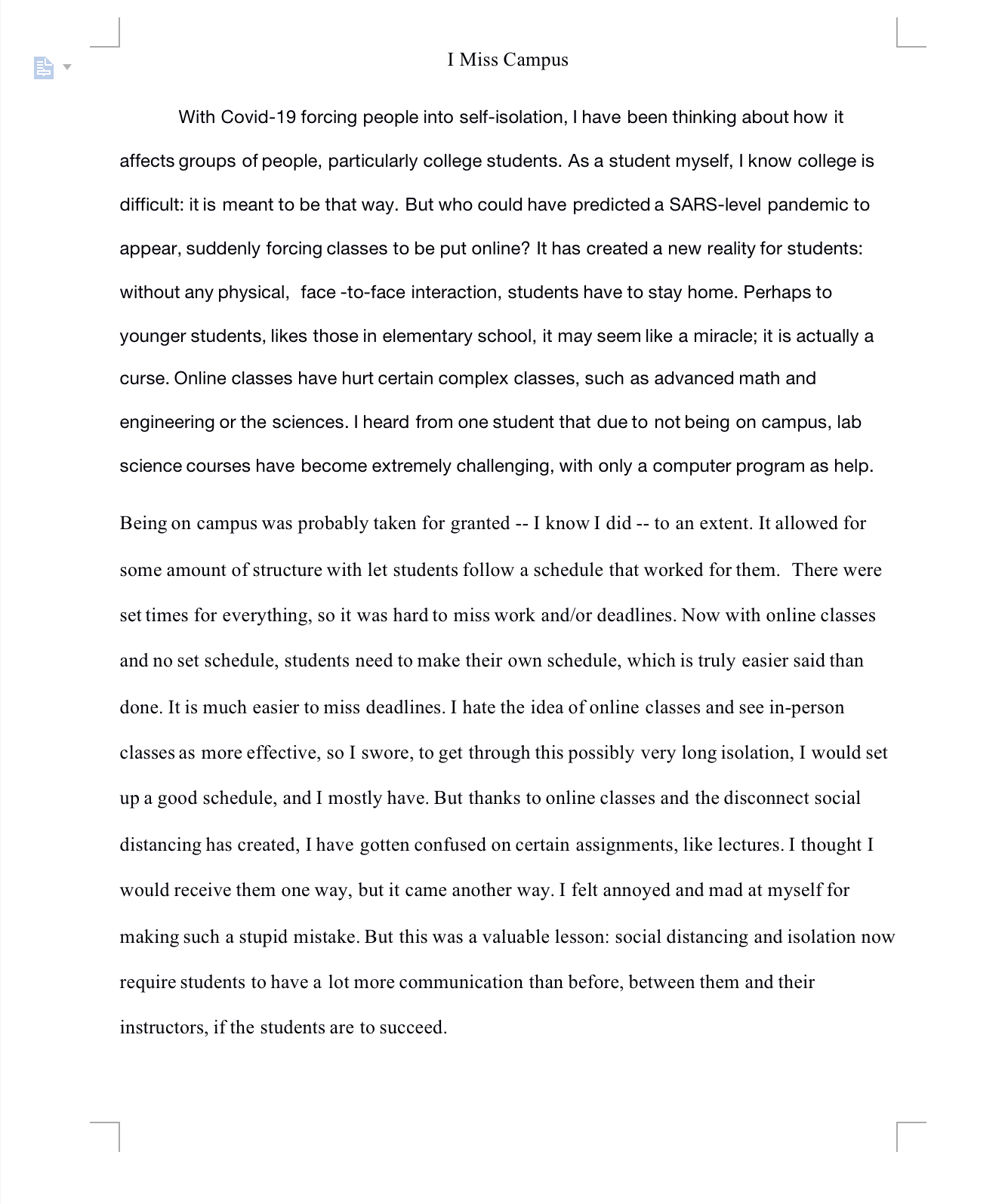 This is a file containing my personal experiences with COVID19 and how it has impacted my day-to-day college life.