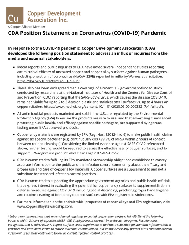 Statement from the Copper Development Association regarding claims of antimicrobial properties of copper.