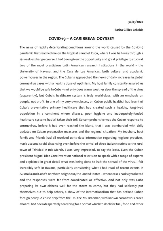 The news of rapidly deteriorating conditions around the world caused by the Covid-19 pandemic first reached me on the tropical island of Cuba, where I was half-way through a 15-week exchange course. I had been given the opportunity and great privilege to study at two of the most prestigious Latin American research institutions in the world – the University of Havana, and the Casa de Las Americas, both cultural and academic powerhouses in the region. The Cubans approached the news of daily increases in global coronavirus cases with a healthy dose of optimism. My host family constantly assured us that we would be safe in Cuba – not only does warm weather slow the spread of the virus (apparently), but Cuba’s healthcare system is truly world-class, with an emphasis on people, not profit. In one of my very own classes, on Cuban public health, I had learnt of Cuba’s preventative primary healthcare that had created such a healthy, long-lived population in a continent where disease, poor hygiene and inadequately-funded healthcare systems had all taken their toll. So comprehensive was the Cuban response to coronavirus, before it had even reached the island, that I was bombarded with daily updates on Cuban preparative measures and the regional situation. My teachers, host family and friends had all received up-to-date information regarding hygiene practices, mask use and social distancing even before the arrival of three Italian tourists to the rural town of Trinidad in mid-March. I was very impressed, to say the least. Even the Cuban president Miguel Diaz-Canel went on national television to speak with a range of experts and explained in great detail what was being done to halt the spread of the virus. I felt incredibly safe in Havana, particularly considering what I had read of recent events in Australia and Cuba’s northern neighbour, the United States – where cases had skyrocketed and the responses were far from coordinated or effective. And not only was Cuba preparing its own citizens well for the storm to come, but they had selflessly put themselves out to help others, a show of the internationalism that has defined Cuban foreign policy. A cruise ship from the UK, the MS Braemar, with known coronavirus cases aboard, had been desperately searching for a port at which to dock for fuel, food and other necessities. Not a single Caribbean country offered the vessel sanctuary – except Cuba. The vessel was allowed to dock at the port of Mariel, in Havana’s west, a neighbourhood I had visited just days earlier! The vessel was allowed to recover the necessary materials and all passengers were sent back to the UK in a well-coordinated aerial operation. This decision polarised the Cubans – while many lauded the government’s response, others saw it as endangering the island. I tend to stand with the former. It was inspirational, particularly being so close to the event itself. The total coronavirus case count in Cuba had barely reached 10 when our program directors announced that our studies in Cuba had been suspended, and that we were to return home within two days following a global escalation in the coronavirus situation. Finding a last-minute flight back from Havana to Melbourne was incredibly stressful, and difficult given the fact that many international flights had already been cancelled. Eventually, I was able to get home – passing through, Havana, Miami, San Francisco, Brisbane and finally Melbourne. It was an odyssey to say the least! I arrived back in Australia on Saturday, March 21, after this gruelling series of flights. I was happy to be among family again, but immensely disappointed that I could not stay in Cuba – in large part because the US and Australia were imposing new border restrictions, and cancelling flights because they could not adequately address the situation. I returned to quiet streets, news of total lockdowns and continued Coalition government inaction in the face of the coronavirus. Meanwhile, just days later Cuba was sending doctors to fight coronavirus in Italy, Argentina and a number of Caribbean islands, so prepared was the nation for what was to come. While I would never consider being without family in these uncertain times, I still know that I would have been safer had I stayed in Cuba, the little socialist island that put the rest of the world to shame in the age of Covid-19.
