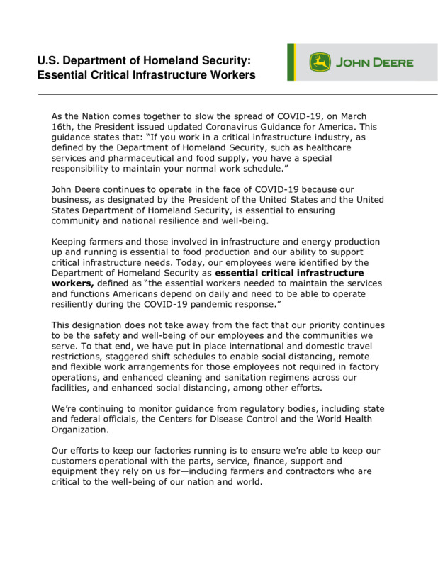 Statement from John Deere about being recognized an essential critical infrastructure worker available via their website. #HIST5241