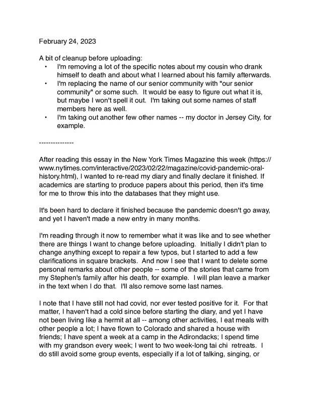 From the beginning, I was aware that this was a world historical event and I wanted to be very attentive to how it played out, both in the news and in my personal life. I read that diaries were scarce in the aftermath of the 1917 pandemic, so it could be useful to scholars to create one this time. I reviewed it before submission, and it reminded me of many things I had already forgotten. Once I started in February 2020, I wrote every day until mid-2021, when entries began to thin out.