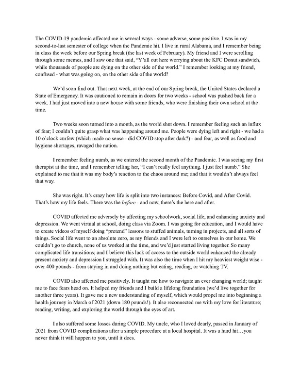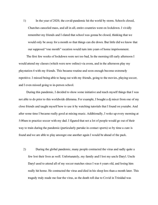 I have uploaded a personal story of how COVID-19 impacted my life; and how, in my mind, there is a before and after, two different sections of my life. I also observe the changes that were influenced by the Pandemic.