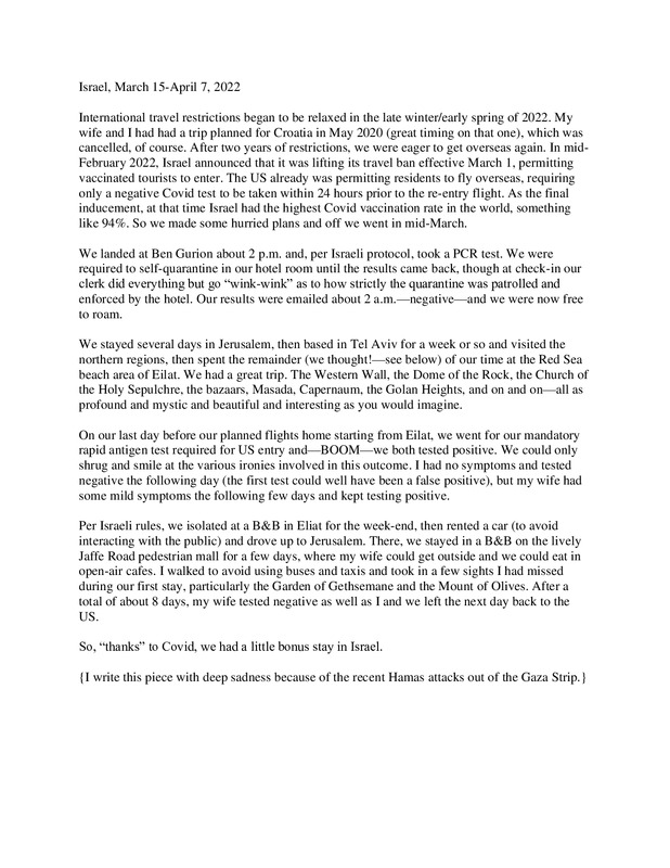 This story relates the issues my wife and I had in dealing with Covid restrictions on a trip to Israel, just two weeks after the travel ban had been lifted. The story has no great significance except, perhaps as an example of "life is irony." While the story itself is trivial and meant to be amusing, I do share it here with a profound sense of sadness over the recent Hamas attacks and their consequences.