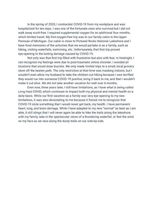 As a survivor of COVID-19 with long-lasting damage, this memory still brings feelings of anger and fear to the surface. It takes place at a family cabin that was the epicenter of many happy memories all the way from childhood through becoming a parent myself. That first trip back forced me to see all that COVID-19 had stolen from me and would continue to steal from me for the rest of my life.