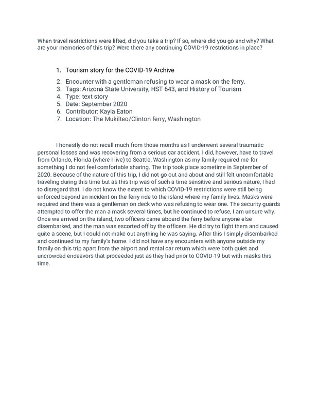 I am submitting a short antidote regarding an individual being upset by being asked to wear a mask on a ferry. This could be important to show how some people resisted COVID-19 restrictions, but this event's importance to me is nonexistent.