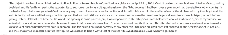 I've included a text story and video of the first time I traveled since the the massive Covid lockdown in March 2020. This text and video are important to me because not only was it a brave thing to do after being confined for so long, but it was also a defining moment in my adult life. I am now married as a result of that trip.
