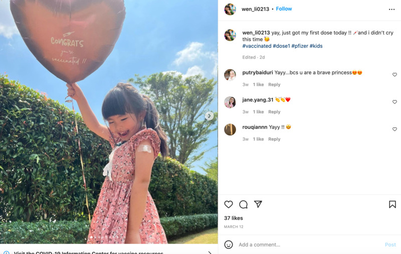 This is an Instagram post by wen_li0213. The kid in this picture has just gotten their first Pfizer dose, and one of the comments is saying that she is a "brave princess" for doing so.