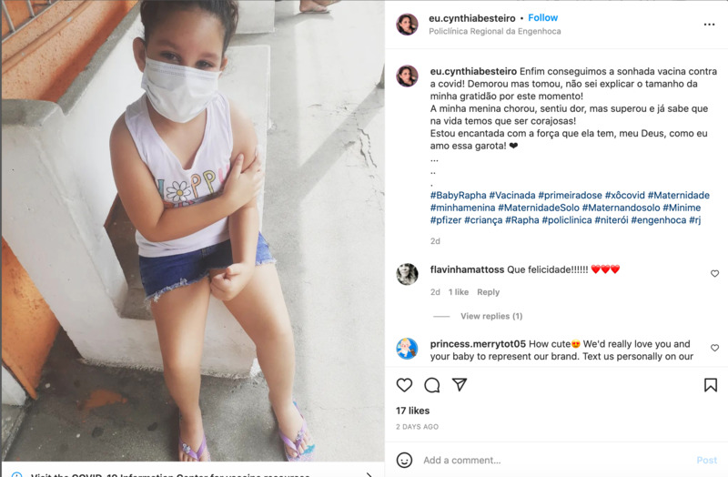 This is an Instagram post by brunaemirella. This post is in Portuguese. This is a picture of a little girl that just received her second Pfizer dose.