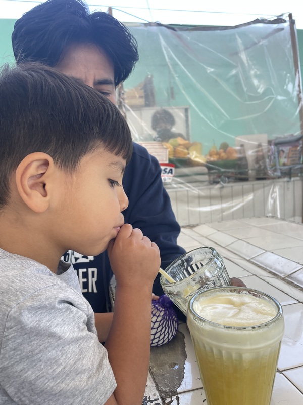 This photograph shows my son drinking fresh orange and pineapple juice at a market in Arequipa, Peru. The juice vendor works behind a plastic sneeze guard, wears a face mask, and disinfects change before returning it to you.