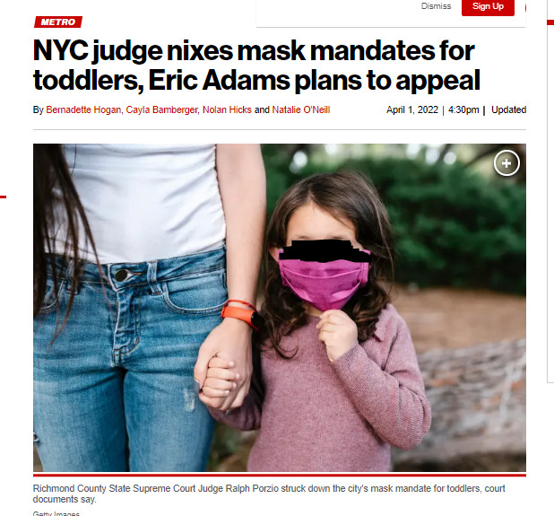 This is a story by Bernadette Hogan, Cayla Bamberger, Nolan Hicks and Natalie O'Neill for the New York Post. This story is about masking for young kids and the struggle within the local government on what is best to do. A Staten Island judge ruled against masks for toddlers in New York City. Parents in support of this claim that this is a good thing because masks could make it harder for kids to socialize and read emotions. Eric Adams, the mayor of New York City, plans to appeal this to reinstate masks, where he believes that if you don't know the vaccination status of everyone in a room that you should wear a mask.