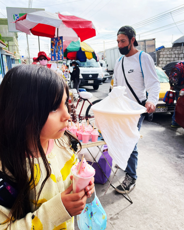 My daughter is attending 2nd grade in Arequipa, Peru for a few months. Today was her first day, and when we went to pick her up the school exit was surrounded by food vendors ready to sell a snack to the kids and parents. In the background of the photo, you can see two food vendors wearing masks, both offering deserts (the woman in the background has an ice cream cart).
