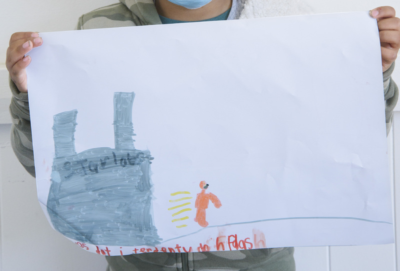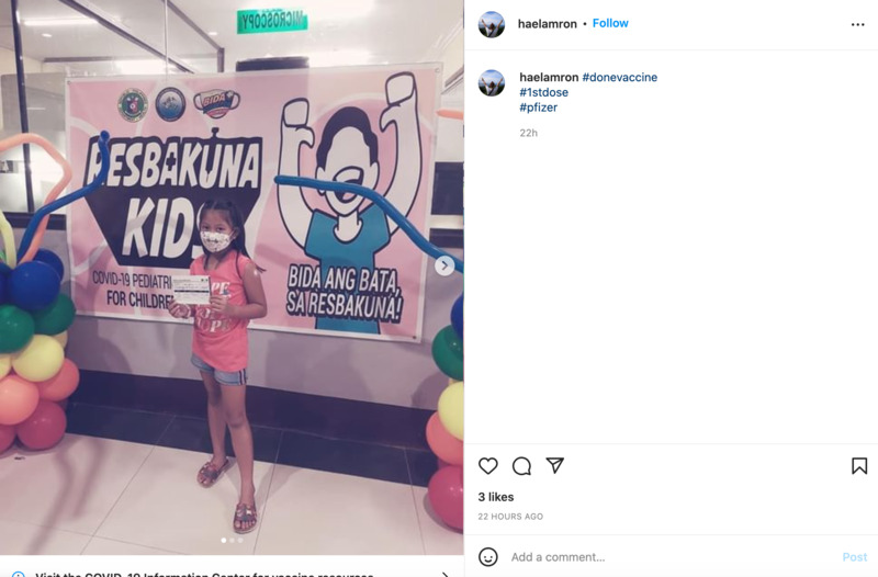 This is an Instagram post by haelmron. This shows a picture of a little kid that had just received their first Pfizer dose. It looks like a special place was set up for kids to get their picture taken after getting vaccinated.