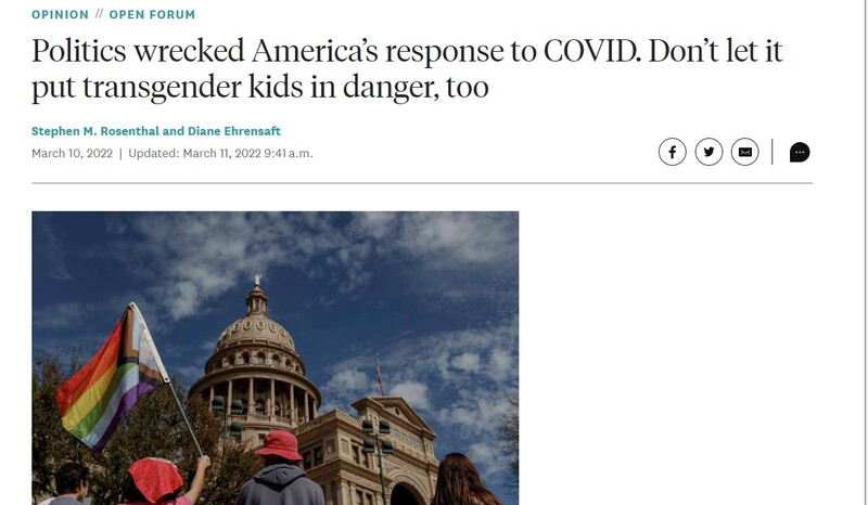 This is a news story from The San Francisco Chronicle, written by Stephen M. Rosenthal and Diane Ehrensaft. This is an opinion piece comparing the government response to COVID and the politics surrounding it to ruining the response. The authors warn that following politics over science is dangerous. It later goes on to talk about the anti-trans legislation being passed through different states, such as: Idaho, Texas, and Florida. The authors believe that science proves that trans kids have no real threat from puberty blockers. A study is also quoted, where it says that gender affirming care for trans youth is linked to lower instances of depression. The point of this article is not so much about COVID itself, but fear of what was done during the peak of COVID being repeated on other types of legislation, and in this case, using politics over science with trans kids.