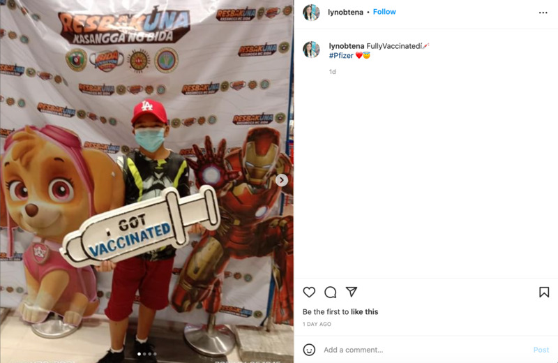 This is an Instagram post by lynobtena. It shows a picture of a kid that had just received his second dose of Pfizer. There is a place for kids to get their picture taken after getting vaccinated, with cardboard cutouts of a Paw Patrol character and Iron Man.
