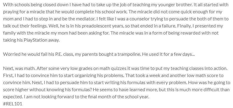 With schools being closed down I have had to take up the job of teaching my younger brother. It all started with praying for a miracle that he would complete his school work. The miracle did not come quick enough for my mom and I had to step in and be the mediator. I felt like I was a counselor trying to persuade the both of them to talk out their feelings. Well, he is in his preadolescent years, so that ended in a failure. Finally, I presented my family with the miracle my mom had been asking for. The miracle was in a form of being rewarded with not taking his PlayStation away.