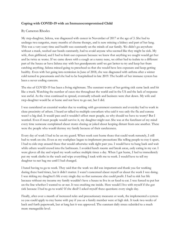My step-daughter, Selena, was diagnosed with cancer in November of 2017 at the age of 3. She had to undergo two surgeries, many months of chemo therapy, and is now missing a kidney and part of her lung. This was a very scary time and health was constantly on the minds of our family. We didn’t go anywhere without a mask, washed our hands constantly, had to avoid anyone who seemed like they might be sick. My wife, then girlfriend, and I had to limit our exposure because we knew that anything we caught would get her and be twice as worse. If we came down with a cough or a runny nose, we either had to isolate to a different part of the house or have Selena stay with her grandparents until we got better to try and keep her from catching anything. Selena missed going to preschool so that she would have less exposure and keep getting healthy. Even with her going into remission in June of 2018, she was diagnosed with asthma after a winter cold turned to pneumonia and she had to be hospitalized in late 2019. The health of her immune system has been a never ending concern.