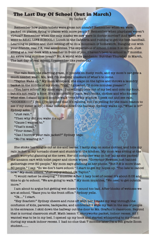 Remember how public toilets were gross not unsafe? Remember when we were packed on planes, flying to places with more people? Remember when playdates weren’t virtual? Remember when the only masks we saw were in doctor movies? And when we went to REAL LIFE SCHOOL!! Lunch in the Cafeteria and rushing to get the best handball. Learning in person and then setting off to do a mountain of homework. Hanging out with your friends, real P.E, real assemblies. The experience of school. I miss it so much. Just sitting at a real desk with a teacher in front of you. I haven’t been to school in 7 months. An extra long summer break? No, A world wide pandemic. But that Thursday in March, The last day of real school, I remember like yesterday.