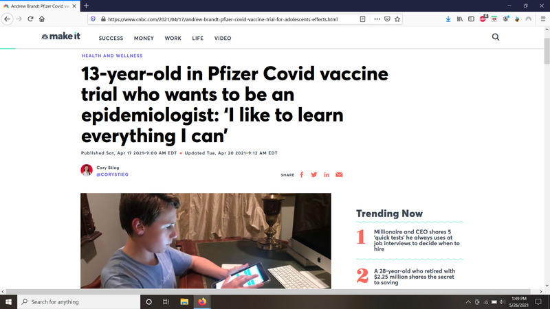 Recently CNBC has released an article on my story in the Pfizer Vaccine Trial. I got interviewed about a week ago, and I helped in the making of the article. It is on a division of CNBC called CNBC Make It. CNBC Make It is a section of CNBC that specializes in money, wellness, and heartwarming stories. I have gotten to know the writer, Cory Stieg, well and it was great working with her. The article goes into detail about how the trial works and my experience with the trial. This experience has been amazing from both ends, Pfizer and CNBC. I hope that I inspired others to make a change in the world and to try and pursue your passions.