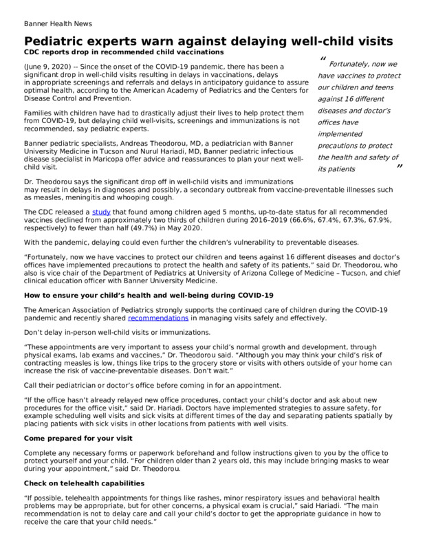 A press release from Banner Health encouraging people to not delay well-child visits due to COVID 19
