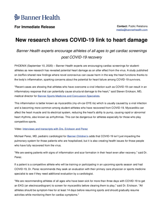 a press release from Banner Health encouraging cardiac screenings for student-athletes as new research has revealed potential heart damage as an after effect from the virus.